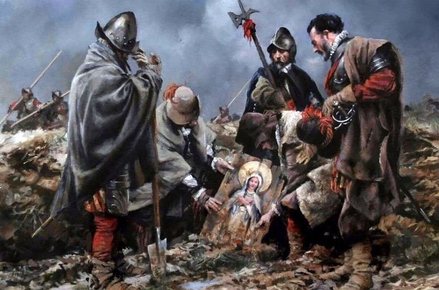 En ese crítico momento un soldado del Tercio cavando una trinchera tropezó con un objeto de madera allí enterrado. Era una tabla flamenca con la imagen de la Inmaculada Concepción.